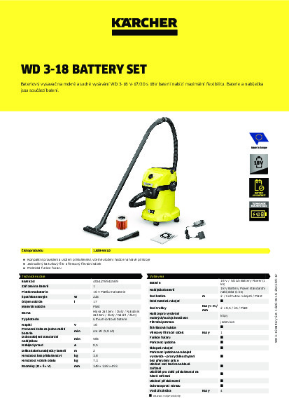 Vysávání, které nezná hranice: bateriový vysavač na mokré a suché vysávání WD 3-18, který je součástí 18 V bateriové platformy Kärcher Battery Power a nabízí maximální flexibilitu, kompaktní design a svobodu pohybu. Přístroj dokonale kombinuje 2 metry dlouhou sací hadici a klipsovou podlahovou hubici a dokáže během okamžiku odstranit mokré, jemné i hrubé nečistoty. Zařízení je dále vybaveno robustní a nárazuvzdornou plastovou nádobou o objemu 17 litrů, jednodílným kartušovým filtrem a také fleecovým filtračním sáčkem. Skladování sací hadice šetří místo; jednoduše jej zavěste na hlavu zařízení. Mezi další funkce patří praktická funkce fukaru pro oblasti, kde není možné vysávání, odkládací prostor na nářadí a drobnosti, otočný spínač pro snadné zapnutí a vypnutí přístroje, ergonomicky tvarované madlo pro přenášení a také "Pull & Push" uzamykací systém, který umožňuje snadné otevírání a zavírání nádoby. Parkovací poloha na nárazníku umožňuje rychlé a pohodlné uložení trubic a podlahové hubice při krátké přestávce při práci. Baterie a nabíječka nejsou součást balení.