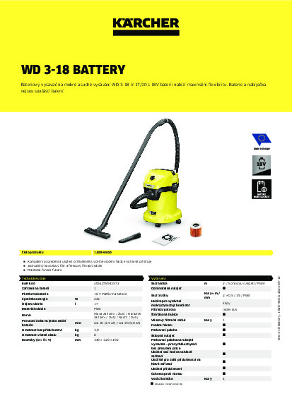 Vysávání, které nezná hranice: bateriový vysavač na mokré a suché vysávání WD 3-18, který je součástí 18 V bateriové platformy Kärcher Battery Power a nabízí maximální flexibilitu, kompaktní design a svobodu pohybu. Přístroj dokonale kombinuje 2 metry dlouhou sací hadici a klipsovou podlahovou hubici a dokáže během okamžiku odstranit mokré, jemné i hrubé nečistoty. Zařízení je dále vybaveno robustní a nárazuvzdornou plastovou nádobou o objemu 17 litrů, jednodílným kartušovým filtrem a také fleecovým filtračním sáčkem. Skladování sací hadice šetří místo; jednoduše jej zavěste na hlavu zařízení. Mezi další funkce patří praktická funkce fukaru pro oblasti, kde není možné vysávání, odkládací prostor na nářadí a drobnosti, otočný spínač pro snadné zapnutí a vypnutí přístroje, ergonomicky tvarované madlo pro přenášení a také "Pull & Push" uzamykací systém, který umožňuje snadné otevírání a zavírání nádoby. Parkovací poloha na nárazníku umožňuje rychlé a pohodlné uložení trubic a podlahové hubice při krátké přestávce při práci. Baterie a nabíječka nejsou součást balení.