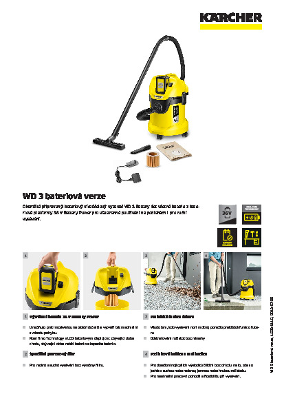 Bateriový vysavač WD 3 Battery Set umožňuje práci nezávislou na elektrické síti při plné funkčnosti víceúčelového vysavače. Doba chodu baterie obsažené v sadě činí 15 minut. Pomocí Real Time Technology zobrazí LCD displej baterie kdykoli její stav. Výkonný vysavač obsahuje robustní a nárazu odolnou plastovou nádobu s objemem 17 litrů. Patronový filtr umožňuje pohodlné vysávání suchých a mokrých nečistot zcela bez výměny filtru. O optimální odstraňování nečistot a čistotu beze zbytků se starají sací hadice s optimálním prouděním i podlahová hubice s vložkou. Při přerušení práce pohodlně zaparkujete sací trubku a podlahovou hubici díky parkovací poloze. Další výhody: funkce fukaru, uzavírací systém „Pull ’n’ Push“, ergonomická rukojeť a mimořádně praktická úschova příslušenství. A díky kompatibilitě s 36 V platformou lze baterii používat i v jiných zařízeních s bateriovou platformou 36 VBattery Power - pro svobodu pohybu bez hranic.