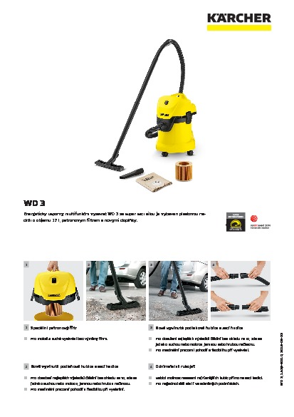 Multifunkční vysavač WD 3 má super sací sílu při spotřebě proudu jen 1000 W. Jeho robustní, nárazu vzdorná plastová nádrž má 17-litrový objem. Patronový filtr umožňuje pohodlné vysávání suchých a mokrých nečistot – a to bez výměny filtru. Nová sací hadice a, na to nesmíme zapomenout, nově vyvinutá podlahová hubice na klipsy se směšovací vložkou zajistí optimální zachycení nečistot a tím dokonalou čistotu. Snadno odnímatelná rukojeť umožňuje montáž příslušenství přímo na sací hadici. Při přerušení práce lze sací trubku a podlahovou hubici díky parkovací poloze pohodlně zaparkovat. Ostatní doplňky jako funkce fukaru, „Pull & Push“ uzavírací systém, ergonomicky tvarovaná rukojeť a velmi praktická úschova kabelů a příslušenství činí úklid s WD 3 skutečným potěšením.