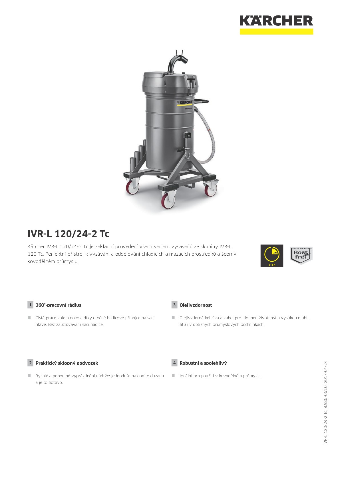 Kärcher IVR-L 120/24-2 Tc je průmyslový vysavač typu Ringler s kompaktní konstrukcí. Je nejvhodnější pro oddělování chladicích a mazacích prostředků a špon. Tento vysavač s dlouhou životnostní získává se svou robustní konstrukcí, olejivzdornými koly a svým olejivzdorným síťovým kabelem body jako pomocník při použití v každodenních nejdrsnějších průmyslových podmínkách. Přístroj disponuje sklopným podvozkem a velkorysou sběrnou nádrží o objemu 120 litrů - je tak ideální pro vysávání velkých množství tekutin a/nebo z velké části bezprašných pevných látek jako např. špon. S volitelně dodávaným košem na špony mohou být pevné látky důkladně odděleny od vysáté tekutiny. Pro obzvláště flexibilní práci bez zamotávání se hadice je zodpovědná přípojka hadice na sací hlavě, která je otočná o 360°. Stav naplnění se dá kdykoliv pohodlně odečíst na vypouštěcí hadici. Vypouštění může být provedeno dvěma způsoby: zaprvé přes vypouštěcí hadici, zadruhé prostřednictvím sklopného podvozku. I naložení na vysokozdvižný vozík je bez problémů možné.