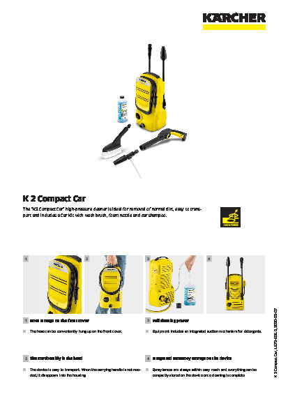 Mimo své praktické velikosti přesvědčuje vysokotlaký čistič K2 Compact Car svou vysokou výkonností. Výhodné rozměry vysokotlakého čističe zajišťují optimální mobilitu a umožňují prostorově úspornou úschovu. Sada Car Kit obsahuje mycí kartáč k efektivnímu odstranění šedivého nádechu automobilu, pěnovací trysku a autošampon ve skládacím kanystru o objemu 500 ml. K dalšímu přístrojovému vybavení patří jedna stříkací pistole, 4 m dlouhá vysokotlaká hadice, jednoduchý pracovní nástavec, rotační tryska s rotujícím bodovým paprskem proti nejodolnějším nečistotám, jakož i spolehlivý vodní filtr pro ochranu čerpadla před částečkami nečistot.