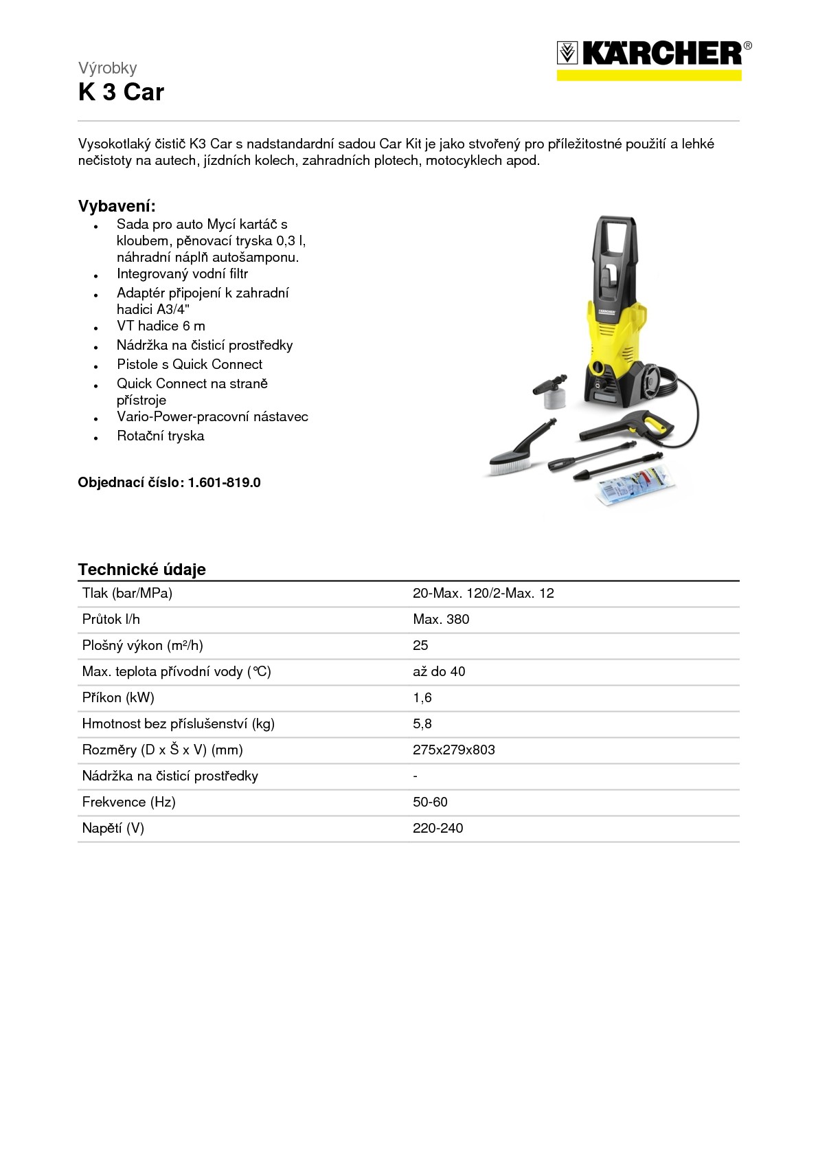 Vysokotlaký čistič K3 Car společnosti Kärcher se sadou Car Kit, která se skládá z mycího kartáče, pěnovací trysky a 0,5 l autošamponu. Tento vysokotlaký čistič, vybavený pistolí Quick Connect a 6 m dlouhou vysokotlakou hadicí, je ideálním pro příležitostné použití v domácnosti a od jízdního kola přes zahradní plot až k motocyklu pečuje o lesknoucí se povrchy. Díky pracovnímu nástavci Vario Power se dá tlak vody jednoduchým otočením snadno regulovat a vždy přizpůsobit konkrétnímu povrchu. Rotační tryska s rotujícím bodovým paprskem odstraňuje i nejodolnější nečistoty. Čerpadlo vysokotlakého čističe „K3“ je chráněno vodním filtrem – pro dlouhou životnost.