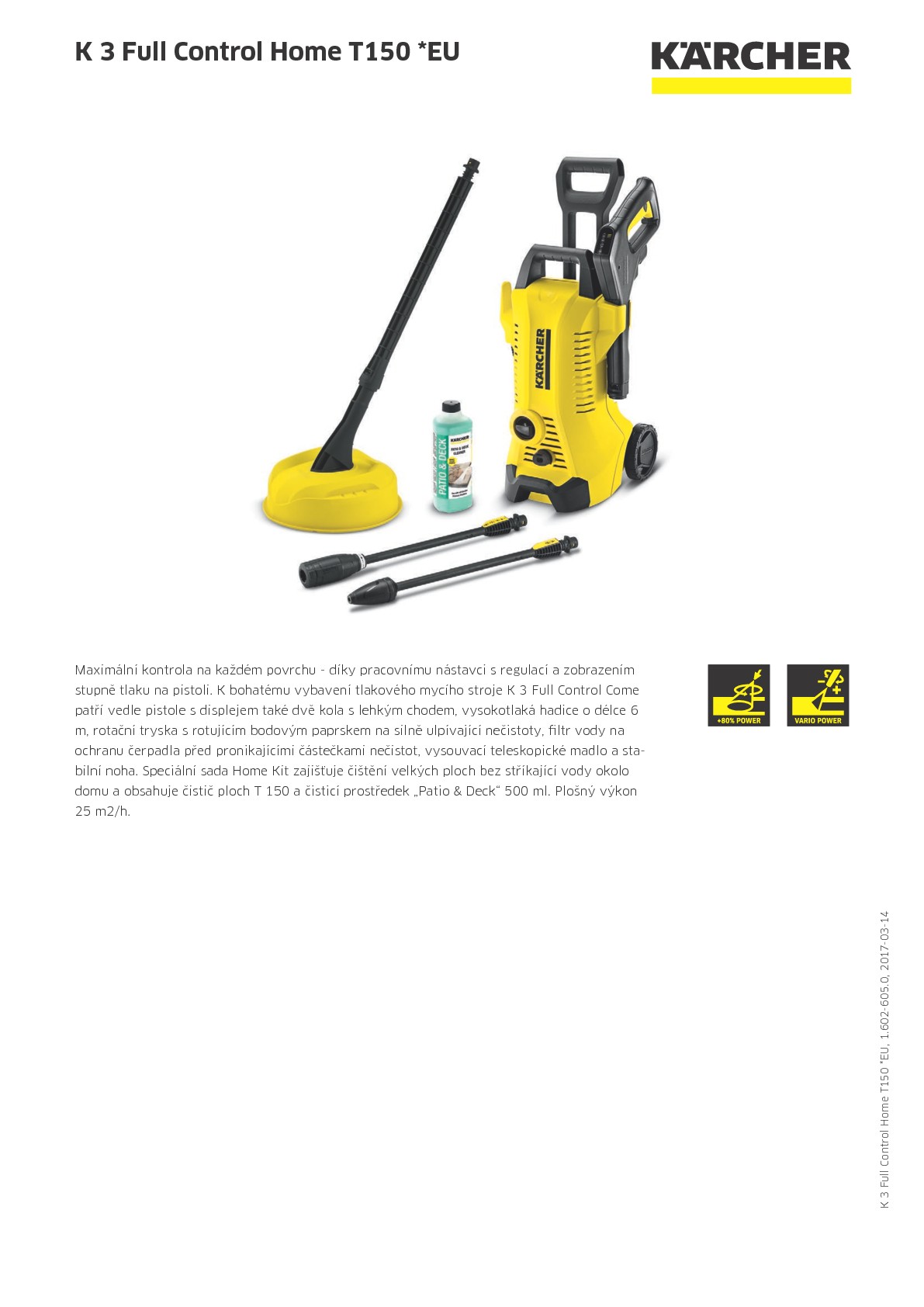 Maximální kontrola na každém povrchu - díky pracovnímu nástavci s regulací a zobrazením stupně tlaku na pistoli. K bohatému vybavení tlakového mycího stroje K 3 Full Control Come patří vedle pistole s displejem také dvě kola s lehkým chodem, vysokotlaká hadice o délce 6 m, rotační tryska s rotujícím bodovým paprskem na silně ulpívající nečistoty, filtr vody na ochranu čerpadla před pronikajícími částečkami nečistot, vysouvací teleskopické madlo a stabilní noha. Speciální sada Home Kit zajišťuje čištění velkých ploch bez stříkající vody okolo domu a obsahuje čistič ploch T 150 a čisticí prostředek „Patio & Deck" 500 ml. Plošný výkon 25 m2/h.