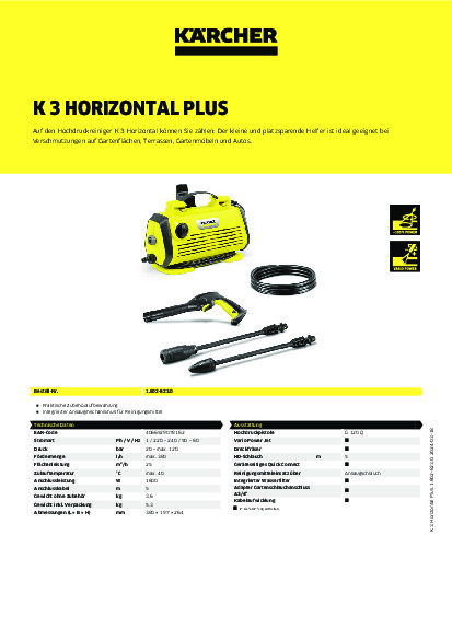 S malým a prostorově úsporným vysokotlakým čističem K 3 je špína minulostí. Díky 5 metrů dlouhé vysokotlaké hadici je čistič ideální pro občasné použití kolem domu a zajistí lesklé povrchy od menších zahradních ploch a teras až po zahradní nábytek a vozidla. Díky tryskové tyči Vario Power (VPS) lze tlak vody jednoduše regulovat pouhým otočením a přizpůsobit příslušnému povrchu. Tryskač nečistot s rotujícím bodovým paprskem odstraňuje i ty nejodolnější nečistoty a čerpadlo je chráněno vodním filtrem - pro dlouhou životnost. Díky své nízké hmotnosti a vestavěné praktické rukojeti lze K 3 Horizontal snadno přepravit na příslušné místo. Systém Quick Connect poskytuje další pohodlí : rychlospojka umožňuje snadné zacvaknutí a vysunutí vysokotlaké hadice do zařízení a pistole. Veškeré přiložené příslušenství lze na K 3 Horizontal snadno uložit.
