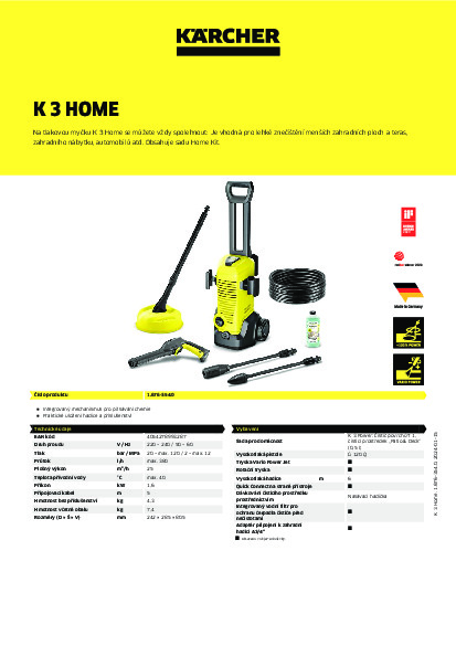 Na tlakovou myčku K 3 Home se můžete vždy spolehnout: Je vhodná pro lehké znečištění menších zahradních ploch a teras, zahradního nábytku, automobilů atd. Obsahuje sadu Home Kit.