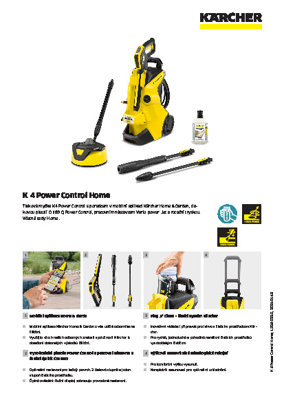Tlaková myčka K 4 Power Control Home snadno vyčistí každý povrch správným tlakem. Díky mobilní aplikaci Kärcher Home & Garden je velmi snadné najít správný tlak: aplikační poradce podporuje uživatele praktickými tipy pro dokonalé výsledky čištění. Mobilní aplikace také nabízí další užitečné funkce, jako jsou montážní pokyny a pokyny pro údržbu a péči. Jakmile je nalezena správná úroveň tlaku, lze ji snadno nastavit otočením pracovního nástavce a zkontrolovat na vysokotlaké pistoli G 160 Q Power Control. K 4 Power Control Home zaujme také čisticím systémem Kärcher Plug ‘n’ Clean pro snadnou výměnu čisticího prostředku, teleskopickou rukojetí pro pohodlnou přepravu, parkovací polohou a snadno přístupným příslušenstvím. Sada Home obsahuje čistič povrchu T5 a čistič kamene 1 l.