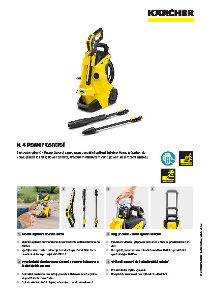 Tlaková myčka K 4 Power Control snadno vyčistí každý povrch správným tlakem. Díky mobilní aplikaci Kärcher Home & Garden je velmi snadné najít správný tlak: aplikační poradce podporuje uživatele praktickými tipy pro dokonalé výsledky čištění. Mobilní aplikace také nabízí další užitečné funkce, jako jsou montážní pokyny a pokyny pro údržbu a péči. Jakmile je nalezena správná úroveň tlaku, lze ji snadno nastavit otočením pracovního nástavce Vario power Jet a zkontrolovat na vysokotlaké pistoli G 160 Q Power Control. K 4 Power Control zaujme také čisticím systémem Kärcher Plug ‘n’ Clean pro snadnou výměnu čisticího prostředku, teleskopickou rukojetí pro pohodlnou přepravu, parkovací polohou a snadno přístupným příslušenstvím.