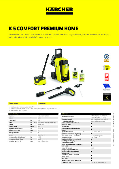 Tlaková myčka K 5 Comfort Premium Home je ideální pro odstranění středního znečištění v okolí domu a automobilu. Součástí balení je sada Home Kit s čističem povrchů T 5 a 1 litrem čističe kamene a fasád. Zařízení je vybaveno robustním vodou chlazeným motorem a poskytuje trvale vysoký čisticí výkon. Integrovaný naviják hadice s flexibilní hadicí PremiumFlex umožňuje pohodlnou manipulaci a zajišťuje maximální volnost pohybu. Spoušťová pistole G 180 Q COMFORT!Hold výrazně snižuje tlak potřebný k držení a zajišťuje tak čištění bez únavy. Praktický systém Quick Connect také umožňuje rychlé připojení a odpojení vysokotlaké hadice. Univerzální 4v1 multi jet tryska umožňuje snadné přepínání mezi 4 rozstřikovými vzory otočením hlavy trysky, čímž se přizpůsobí různým úklidovým úkolům. Koncept čisticího prostředku 2 v 1 navíc nabízí větší pohodlí a dokonalé nanášení čisticího prostředku podle daného úkolu. Kabely a příslušenství lze snadno a kompaktně uložit na zařízení. Pro optimální podporu nabízí aplikace Kärcher Home & Garden integrovaného poradce pro použití a užitečné tipy a triky.