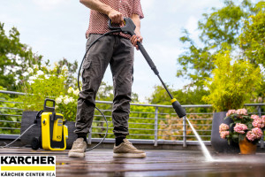 Tlaková myčka K 5 Comfort Premium Home s výkonem 40 m²/h, vodou chlazeným motorem, hadicí PremiumFlex a navijákem na hadici odstraňuje střední znečištění. S sadou Home Kit.