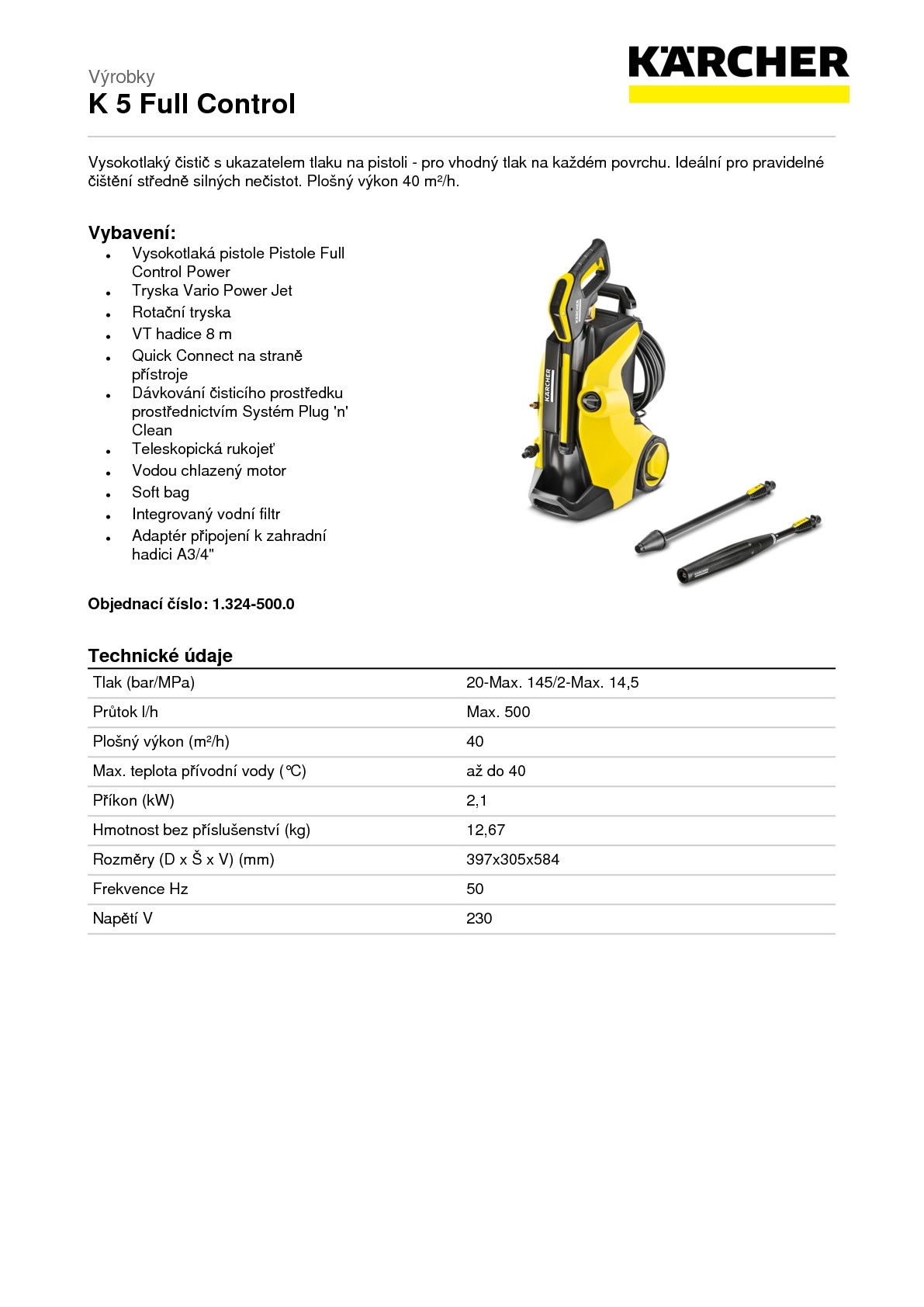 Přístroj je vhodný pro pravidelné čištění středně silných nečistot a pro plošný výkon 40 m²/h. S vysokotlakým čističem Kärcher K 5 Full Control Flex budete na každém povrchu používat ten nejvhodnější tlak. Stupeň tlaku se nastavuje na pracovním nástavci a lze jej překontrolovat na LED-kontrolce na pistoli - pro maximální kontrolu. Změna z vysokého tlaku na režim čisticího prostředku probíhá bez výměny pracovního nástavce. Pistole je okamžitě při ruce a při ... Přístroj je vhodný pro pravidelné čištění středně silných nečistot a pro plošný výkon 40 m²/h. S vysokotlakým čističem Kärcher K 5 Full Control Flex budete na každém povrchu používat ten nejvhodnější tlak. Stupeň tlaku se nastavuje na pracovním nástavci a lze jej překontrolovat na LED-kontrolce na pistoli - pro maximální kontrolu. Změna z vysokého tlaku na režim čisticího prostředku probíhá bez výměny pracovního nástavce. Pistole je okamžitě při ruce a při krátkých pracovních přestávkách může být spolu s pracovním nástavcem prozatímně zaparkována. S výškově nastavitelným teleskopickým držadlem můžete přístrojem pohybovat v pohodlné výšce vysunutí a kompaktně jej uskladnit. Díky snadno přístupnému systému Plug 'n' Clean vyměníte jedním pohybem ruky čisticí prostředek a rozpoznáte stav naplnění na jeden pohled. Tento vysokotlaký čistič Vás dále přesvědčí nízko položeným těžištěm a podstavnou nožkou pro větší stabilitu, jakož i praktickým vedením hadice. Podstavná nožka může být použita i jako druhé držadlo, díky čemuž se přístroj dá velmi lehce nadzvednout do regálu nebo uložit do zavazadlového prostoru auta.