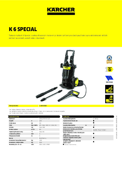 Tlaková myčka K 6 Special je vybavena vodou chlazeným motorem a byla navržena pro časté čištění, stejně jako pro odstraňování značného množství nečistot, které se často vyskytují na cestách, bazénech, velkých vozidlech atd. Rozsah vybavení obsahuje vysokotlakou pistoli s praktickým adaptérem Quick Connect, vysokotlakou hadici s délkou 10 m, spolehlivý vodní filtr, který chrání čerpadlo, stříkací nástavec Vario Power (VPS) a rotační trysku s bodovým paprskem. Nastavení tlaku na VPS lze upravit pouhým otočením ruky a rotační tryska zvládne i ty nejodolnější nečistoty.