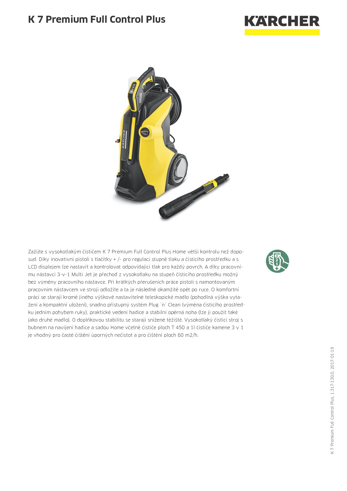 S vysokotlakým čističem K 7 Premium Full Control Plus máte větší kontrolu než doposud. Díky inovativní pistoli s tlačítky +/- pro regulaci stupně tlaku a čisticího prostředku a s LCD displejem lze nastavit a kontrolovat odpovídající tlak pro každý povrch. A díky pracovnímu nástavci 3-v-1 Multi Jet je přechod z vysokého tlaku na stupeň čisticího prostředku možný bez výměny pracovního nástavce. Při krátkých přerušeních práce pistoli s namontovaným pracovním nástavcem ve stroji odložíte a ta je následně okamžitě opět po ruce. O komfortní práci se starají kromě jiného výškově nastavitelné teleskopické madlo (pohodlná výška vytažení a kompaktní uložení), snadno přístupný systém Plug ´n´ Clean (výměna čisticího prostředku jedním pohybem ruky), praktické vedení hadice a stabilní opěrná noha (lze ji použít také jako druhé madlo). O doplňkovou stabilitu se starají snížené těžiště. Vysokotlaká myčka tzv. vapka s bubnem na navíjení hadice a je vhodný pro časté čištění úporných nečistot a pro čištění ploch 60 m2/h.
