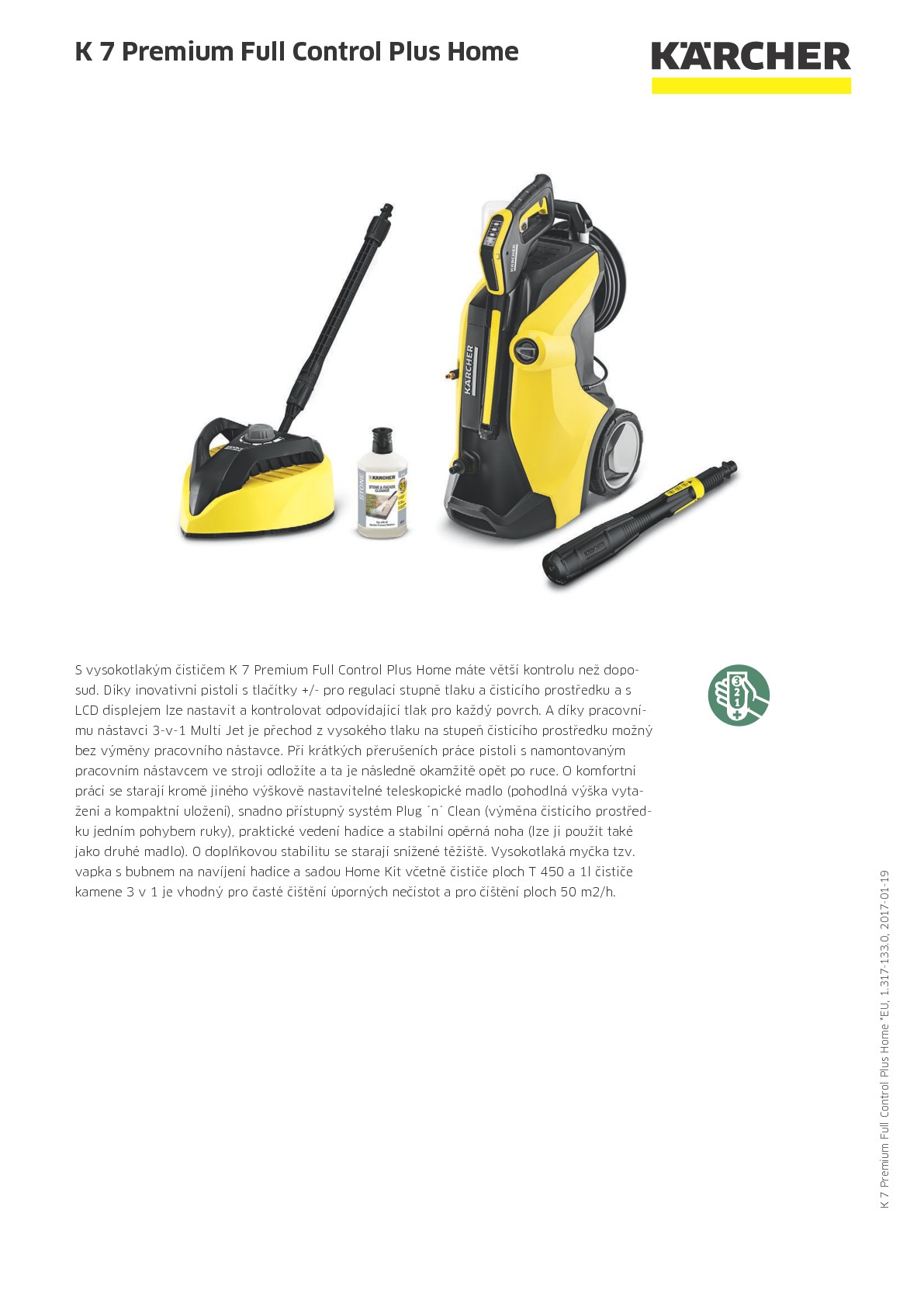 S vysokotlakým čističem K 7 Premium Full Control Plus Home máte větší kontrolu než doposud. Díky inovativní pistoli s tlačítky +/- pro regulaci stupně tlaku a čisticího prostředku a s LCD displejem lze nastavit a kontrolovat odpovídající tlak pro každý povrch. A díky pracovnímu nástavci 3-v-1 Multi Jet je přechod z vysokého tlaku na stupeň čisticího prostředku možný bez výměny pracovního nástavce. Při krátkých přerušeních práce pistoli s namontovaným pracovním nástavcem ve stroji odložíte a ta je následně okamžitě opět po ruce. O komfortní práci se starají kromě jiného výškově nastavitelné teleskopické madlo (pohodlná výška vytažení a kompaktní uložení), snadno přístupný systém Plug ´n´ Clean (výměna čisticího prostředku jedním pohybem ruky), praktické vedení hadice a stabilní opěrná noha (lze ji použít také jako druhé madlo). O doplňkovou stabilitu se starají snížené těžiště. Vysokotlaká myčka tzv. vapka s bubnem na navíjení hadice a sadou Home Kit včetně čističe ploch T 450 a 1l čističe kamene 3 v 1 je vhodný pro časté čištění úporných nečistot a pro čištění ploch 50 m2/h.