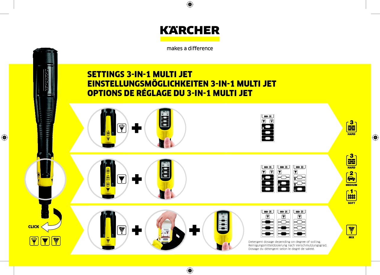 - Pracovní nástavec Multi Jet 3-v-1 - Jednoduché přepínání mezi tryskou plochého paprsku, rotačního paprsku a čisticího prostředku pootočením na pracovním nástavci.