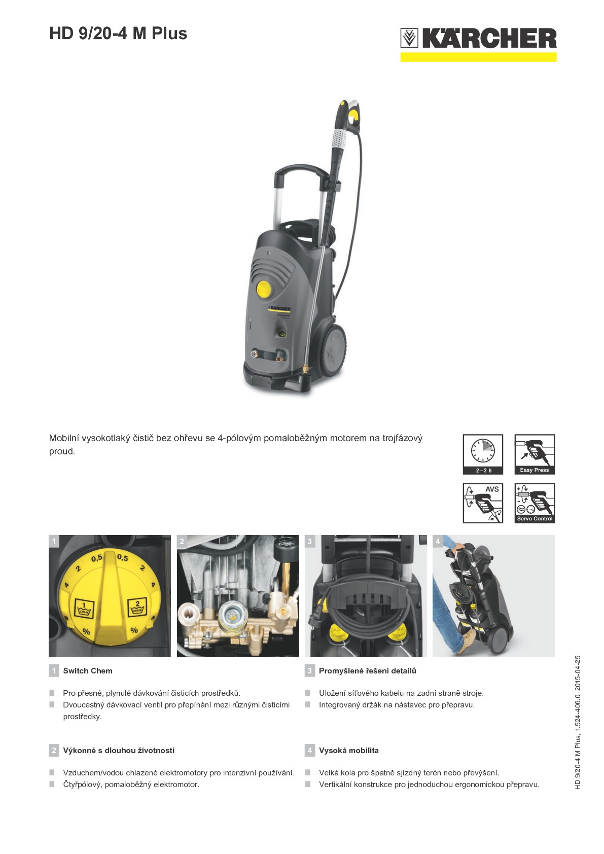 Vysoce výkonný a robustní vysokotlaký studenovodní stroj Kärcher HD 9/20-4 M Plus střední třídy. Médiem vysokého tlaku je kvalitní tří pístové axiální čerpadlo s mosaznou hlavou a keramickými písty, jehož médiem je pomaloběžný, čtyřpólový, vzduche