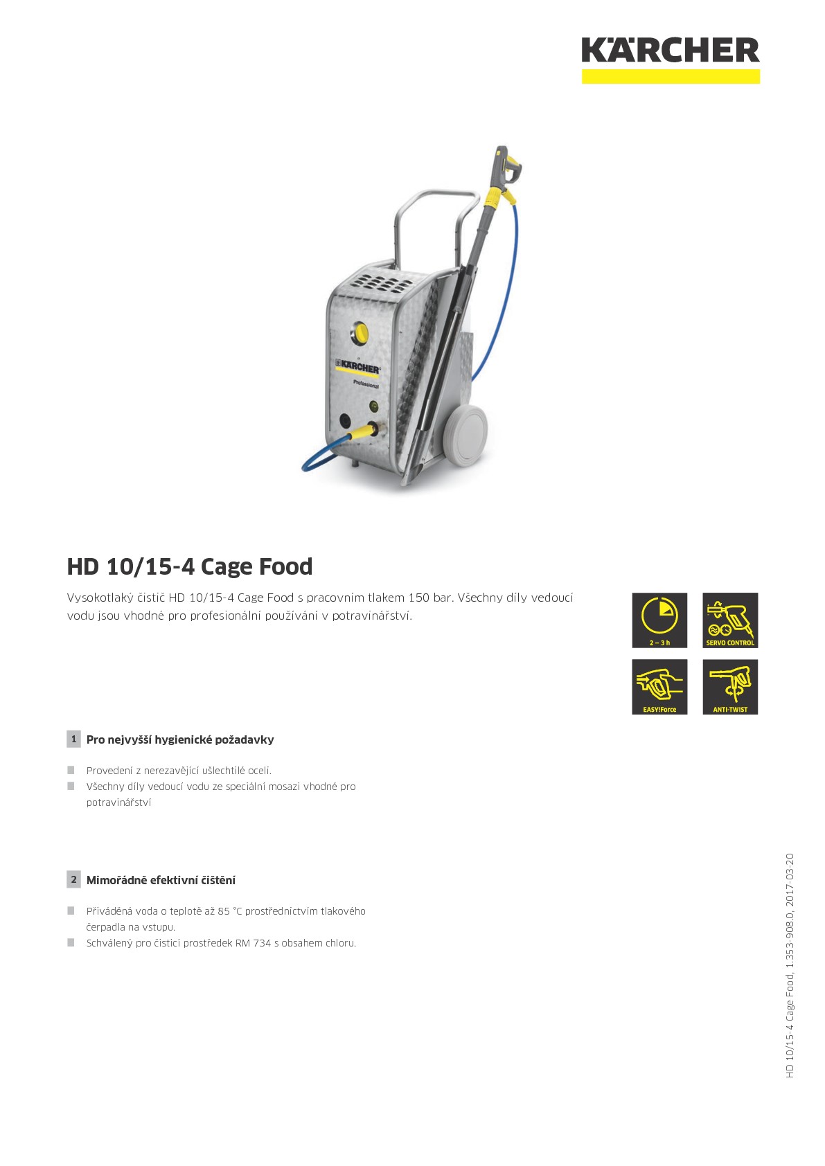 Vysokotlaký čistič HD 10/15-4 Cage Food s pracovním tlakem 150 bar. Všechny díly vedoucí vodu jsou vhodné pro profesionální používání v potravinářství.