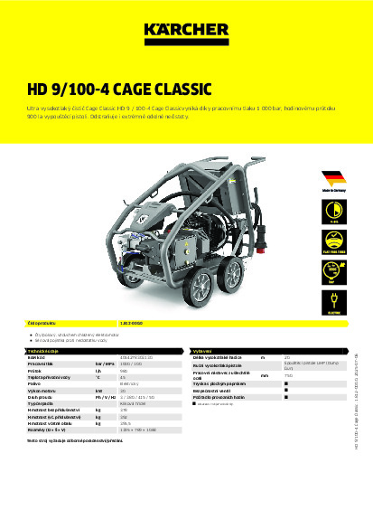 Ultra vysokotlaký čistič Cage Classic HD 9/100-4 Cage Classic vyniká díky pracovnímu tlaku 1 000 bar, hodinovému průtoku 900 l a vypouštěcí pistoli. Odstraňuje i extrémně odolné nečistoty.