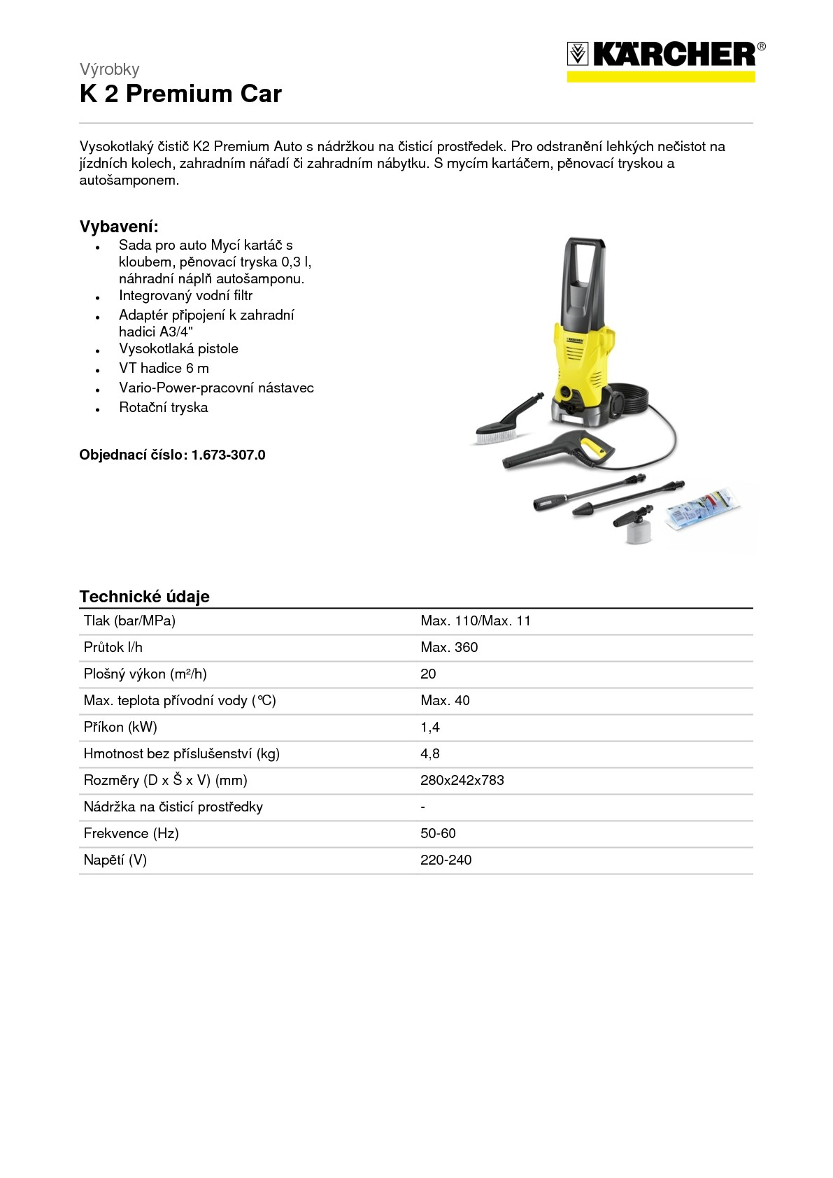 Praktická nádržka na čisticí prostředek umožňuje pohodlnější práci s vysokotlakým čističem K2 Premium Car. Tento přístroj je vybaven s mycím kartáčem, pěnovací tryskou a autošamponem. Je ideální zvláště k čištění vozidel. I s lehkými nečistotami jako např. na jízdních kolech, zahradním nářadí či zahradním nábytku si tento vysokotlaký čistič lehce poradí. K dalšímu vybavení přístroje patří jedna stříkací pistole, 6 m dlouhá vysokotlaká hadice, pracovní nástavec Vario Power, který lze přenastavit pouhým otočením, dále rotační tryska s rotujícím bodovým paprskem na odolné nečistoty, jakož i vodní filtr pro ochranu čerpadla před vnikajícími nečistotami.