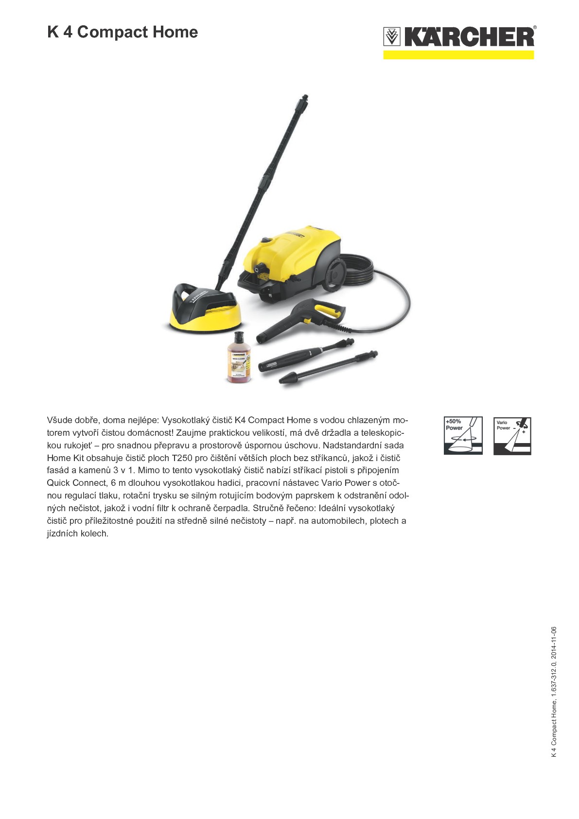 Všude dobře, doma nejlépe: Vysokotlaký čistič K4 Compact Home s vodou chlazeným motorem vytvoří čistou domácnost! Zaujme praktickou velikostí, má dvě držadla a teleskopickou rukojeť – pro snadnou přepravu a prostorově úspornou úschovu. Nadstandardní sada Home Kit obsahuje čistič ploch T250 pro čištění větších ploch bez stříkanců, jakož i čistič fasád a kamenů 3 v 1. Mimo to tento vysokotlaký čistič nabízí stříkací pistoli s připojením Quick Connect, 6 m dlouhou vysokotlakou hadici, pracovní nástavec Vario Power s otočnou regulací tlaku, rotační trysku se silným rotujícím bodovým paprskem k odstranění odolných nečistot, jakož i vodní filtr k ochraně čerpadla. Stručně řečeno: Ideální vysokotlaký čistič pro příležitostné použití na středně silné nečistoty – např. na automobilech, plotech a jízdních kolech.