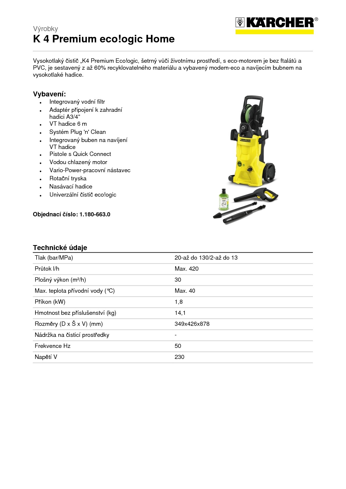 Vysokotlaký čistič „K4 Premium Eco!ogic, šetrný vůči životnímu prostředí, s eco-motorem je bez ftalátů a PVC, je sestavený z až 60% recyklovatelného materiálu a vybavený modem-eco a navíjecím bubnem na vysokotlaké hadice.