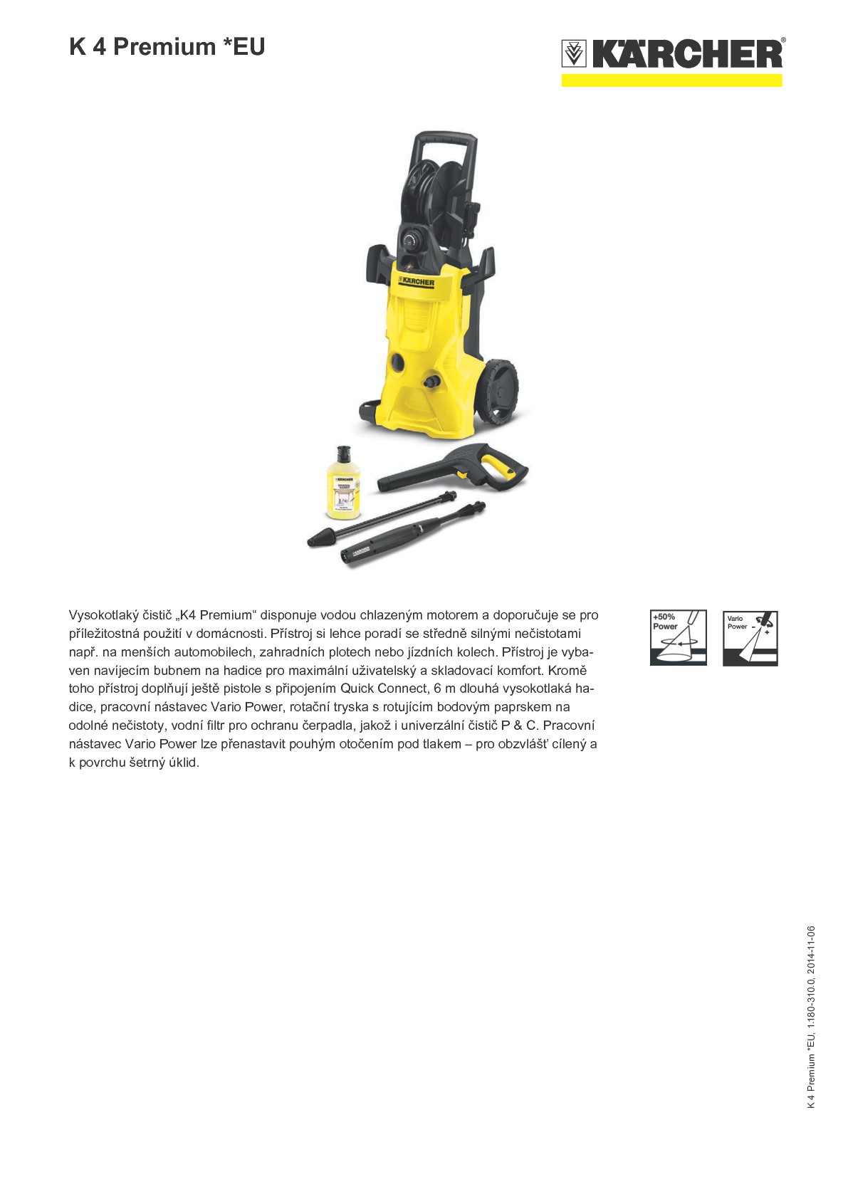 Vysokotlaký čistič „K4 Premium“ disponuje vodou chlazeným motorem a doporučuje se pro příležitostná použití v domácnosti. Přístroj si lehce poradí se středně silnými nečistotami např. na menších automobilech, zahradních plotech nebo jízdních kolech. Přístroj je vybaven navíjecím bubnem na hadice pro maximální uživatelský a skladovací komfort. Kromě toho přístroj doplňují ještě pistole s připojením Quick Connect, 6 m dlouhá vysokotlaká hadice, pracovní nástavec Vario Power, rotační tryska s rotujícím bodovým paprskem na odolné nečistoty, vodní filtr pro ochranu čerpadla, jakož i univerzální čistič P & C. Pracovní nástavec Vario Power lze přenastavit pouhým otočením pod tlakem – pro obzvlášť cílený a k povrchu šetrný úklid.