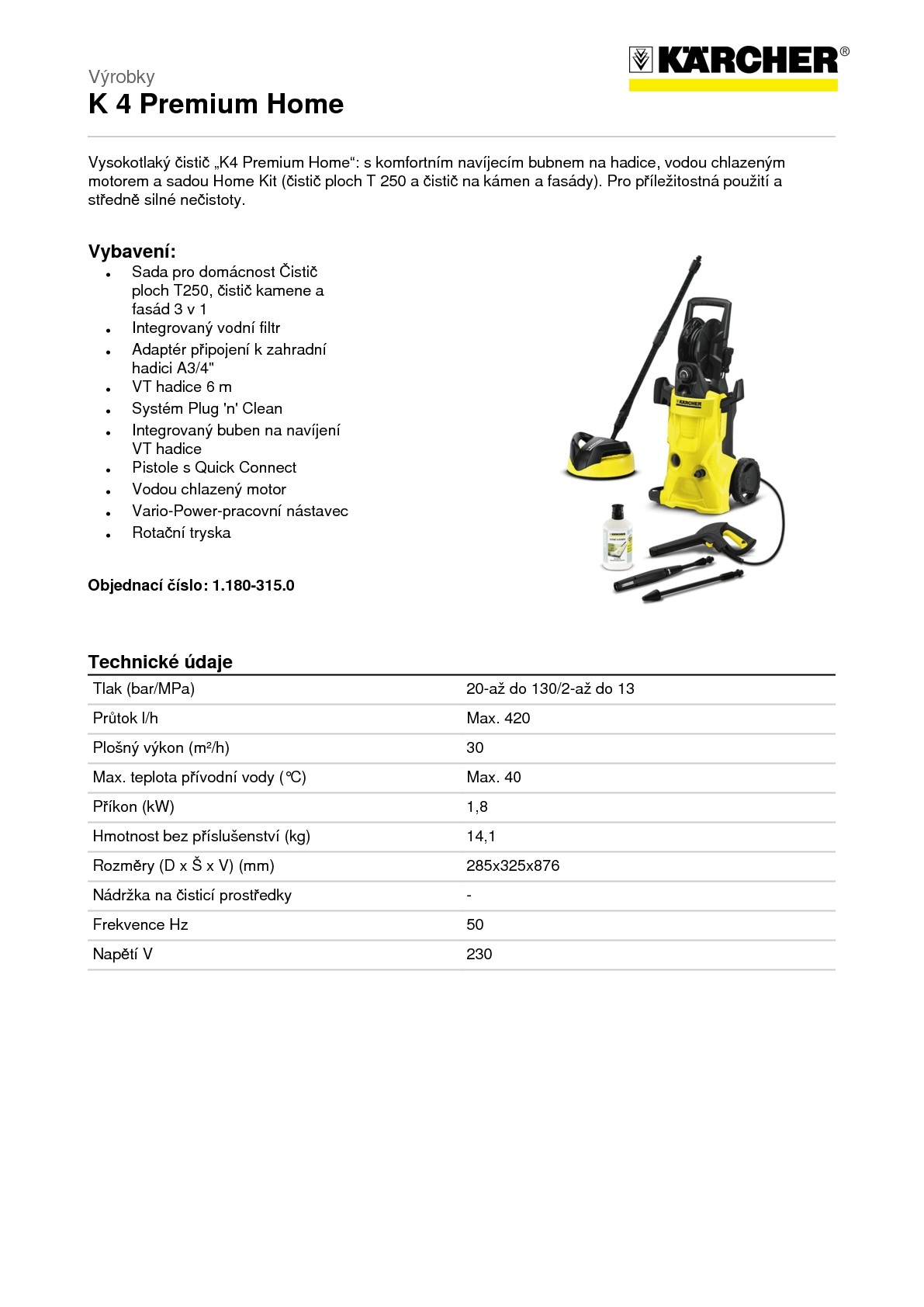 Ať už menší automobily, zahradní ploty nebo jízdní kola – přístroj „K4 Premium Home“ je praktický vysokotlaký čistič pro příležitostné použití a středně silné nečistoty v domácnosti. Je vybaven vodou chlazeným motorem a nabízí navíjecí buben na hadice pro maximální uživatelský a skladovací komfort. Dále jej doplňuje pistole Quick Connect, 6 m dlouhá vysokotlaká hadice a vodní filtr pro ochranu čerpadla. U pracovního nástavce Vario Power se dá otočením přizpůsobit tlak vody přesně konkrétní čistící situaci. Rotační tryska odstraňuje se svým rotujícím bodovým paprskem i nejodolnější nečistoty. Sada Home Kit obsahuje čistič ploch T 250 pro čištění rovných ploch bez stříkanců, jakož i čistič na kámen a fasády (o objemu 1 l) od společnosti Kärcher.