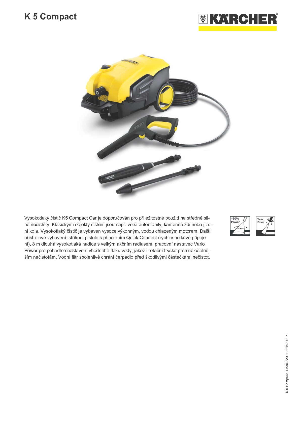 Vysokotlaký čistič K5 Compact je doporučován pro příležitostné použití na středně silné nečistoty. Klasickými objekty čištění jsou např. větší automobily, kamenné zdi nebo jízdní kola. Vysokotlaký čistič je vybaven vysoce výkonným, vodou chlazeným motorem. Další přístrojové vybavení: stříkací pistole s připojením Quick Connect (rychlospojkové připojení), 8 m dlouhá vysokotlaká hadice s velkým akčním radiusem, pracovní nástavec Vario Power pro pohodlné nastavení vhodného tlaku vody, jakož i rotační tryska proti nejodolnějším nečistotám. Vodní filtr spolehlivě chrání čerpadlo před škodlivými částečkami nečistot.