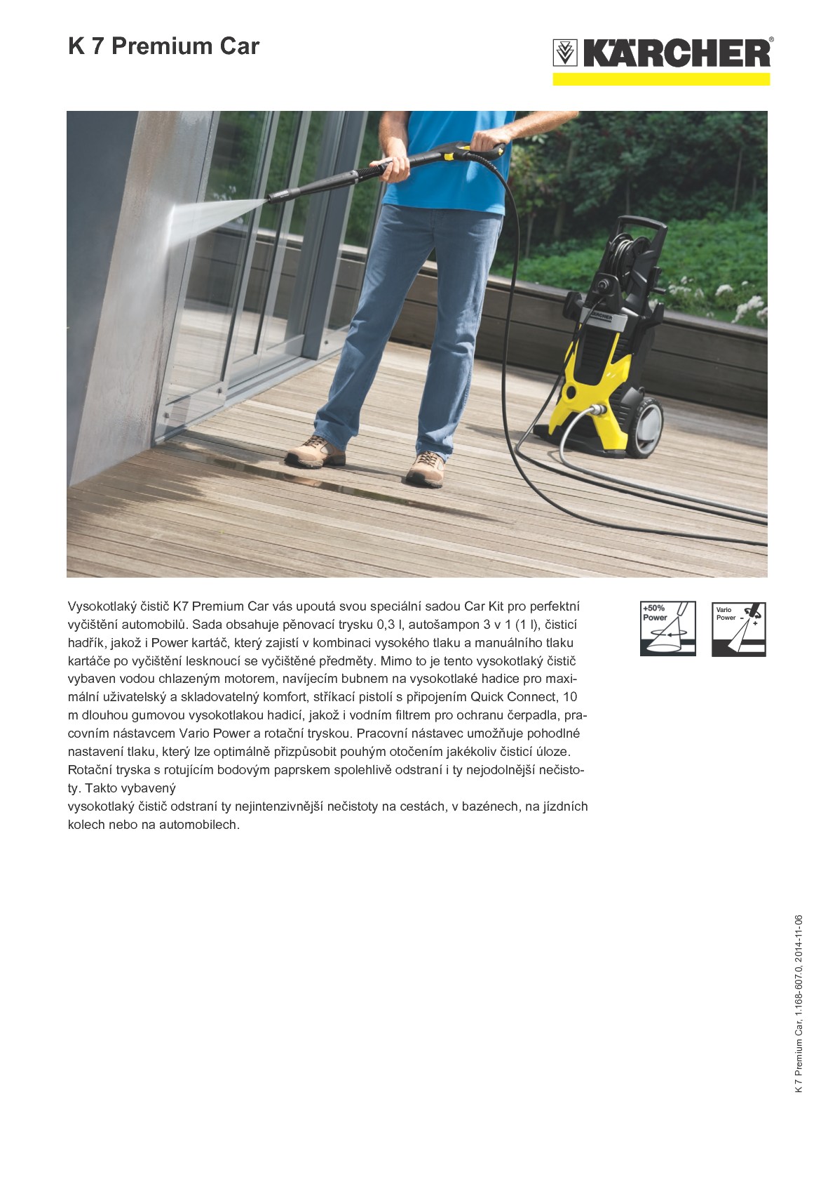 Vysokotlaký čistič K7 Premium Car vás upoutá svou speciální sadou Car Kit pro perfektní vyčištění automobilů. Sada obsahuje pěnovací trysku 0,3 l, autošampon 3 v 1 (1 l), čisticí hadřík, jakož i Power kartáč, který zajistí v kombinaci vysokého tlaku a manuálního tlaku kartáče po vyčištění lesknoucí se vyčištěné předměty. Mimo to je tento vysokotlaký čistič vybaven vodou chlazeným motorem, navíjecím bubnem na vysokotlaké hadice pro maximální uživatelský a skladovatelný komfort, stříkací pistolí s připojením Quick Connect, 10 m dlouhou gumovou vysokotlakou hadicí, jakož i vodním filtrem pro ochranu čerpadla, pracovním nástavcem Vario Power a rotační tryskou. Pracovní nástavec umožňuje pohodlné nastavení tlaku, který lze optimálně přizpůsobit pouhým otočením jakékoliv čisticí úloze. Rotační tryska s rotujícím bodovým paprskem spolehlivě odstraní i ty nejodolnější nečistoty. Takto vybavenývysokotlaký čistič odstraní ty nejintenzivnější nečistoty na cestách, v bazénech, na jízdních kolech nebo na automobilech.