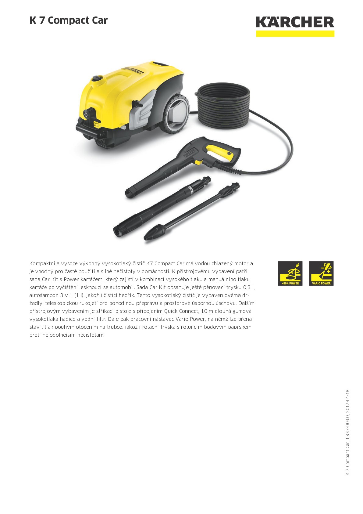 Kompaktní a vysoce výkonný vysokotlaký čistič K7 Compact Car má vodou chlazený motor a je vhodný pro časté použití a silné nečistoty v domácnosti. K přístrojovému vybavení patří sada Car Kit s Power kartáčem, který zajistí v kombinaci vysokého tlaku a manuálního tlaku kartáče po vyčištění lesknoucí se automobil. Sada Car Kit obsahuje ještě pěnovací trysku 0,3 l, autošampon 3 v 1 (1 l), jakož i čisticí hadřík. Tento vysokotlaký čistič je vybaven dvěma držadly, teleskopickou rukojetí pro pohodlnou přepravu a prostorově úspornou úschovu. Dalším přístrojovým vybavením je stříkací pistole s připojením Quick Connect, 10 m dlouhá gumová vysokotlaká hadice a vodní filtr. Dále pak pracovní nástavec Vario Power, na němž lze přenastavit tlak pouhým otočením na trubce, jakož i rotační tryska s rotujícím bodovým paprskem proti nejodolnějším nečistotám.