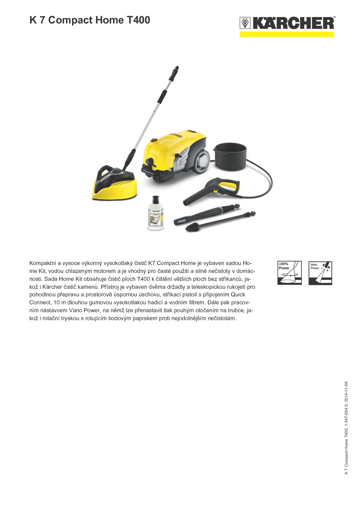 Kompaktní a vysoce výkonný vysokotlaký čistič K7 Compact Home je vybaven sadou Home Kit, vodou chlazeným motorem a je vhodný pro časté použití a silné nečistoty v domácnosti. Sada Home Kit obsahuje čistič ploch T 450 k čištění větších ploch bez stříkanců, jakož i Kärcher čistič kamenů. Přístroj je vybaven dvěma držadly a teleskopickou rukojetí pro pohodlnou přepravu a prostorově úspornou úschovu, stříkací pistolí s připojením Quick Connect, 10 m dlouhou gumovou vysokotlakou hadicí a vodním filtrem. Dále pak pracovním nástavcem Vario Power, na němž lze přenastavit tlak pouhým otočením na trubce, jakož i rotační tryskou s rotujícím bodovým paprskem proti nejodolnějším nečistotám.