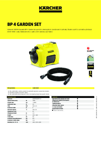 Spolehlivé čerpadlo BP 4 Garden Set vás potěší svým výkonem a odolností. Nevyžaduje speciální údržbu a je vyrobené z prvotřídních materiálů, které zaručují dlouhou životnost zařízení. Výdrž čerpadla podporuje také tepelná pojistka, která brání přehřátí přístroje. K zařízení navíc zdarma získáte prodlouženou záruku 5 let – stačí si jej zaregistrovat na našem webu. Manipulaci s čerpadlem usnadňuje ergonomická rukojeť a praktický nožní spínač, s nímž přístroj zapnete i bez namáhání zad. V balení naleznete také 3,5m odolnou sací hadici (3/4" průměr, připojovací závit G1") se zpětnou klapkou, díky níž je zařízení ihned připraveno k práci. Hadici navíc k přístroji připojíte i bez použití nářadí pouhým nacvaknutím. K čerpadlu doporučujeme přikoupit také elektronický tlakový spínač, který umožní automatický chod přístroje.