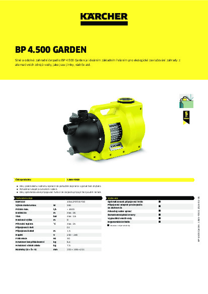 Kompaktní, robustní zahradní čerpadlo BP 4.500 Garden s dlouhou životností je perfektním základním modelem pro zavlažování zahrady vodou z alternativních zdrojů, jako jsou nádrže. Čerpadlo přesvědčí vysokým sacím výkonem a optimálním tlakovým výkonem. BP 4.500 Garden lze pohodlně přepravovat díky ergonomické rukojeti a nízké hmotnosti. Zahradní čerpadlo je také bezúdržbové a lze jej připojit bez potřeby jakéhokoli nářadí. Zařízení lze pohodlně zapínat a vypínat pomocí velkého nožního spínače a chránit tak záda. Použití vysoce kvalitních materiálů zaručuje dlouhou životnost. Kärcher také nabízí prodlouženou záruku na pět let. A co víc: S elektronickým tlakovým spínačem lze BP 4.500 Garden upgradovat na čerpadlo s automatickou funkcí Start/Stop. To znamená ještě větší komfort z hlediska zavlažování zahrady. Ale to není vše: Modernizované čerpadlo je perfektní pro zásobování užitkovou vodou v domácnosti.