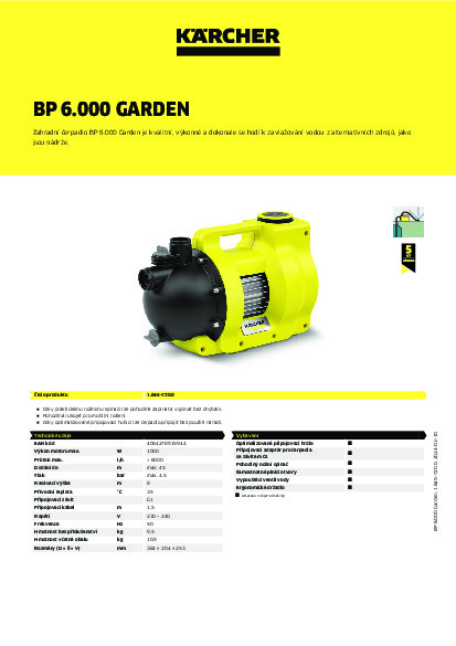Vodu z vodních jímek, nádrží atd. může zahradní čerpadlo BP 6.000 Garden od Kärcher využívat pohodlným, hospodárným a ekologickým způsobem. Kompaktní vodní čerpadlo poskytuje vysoký sací výkon a tlakový výkon. Materiály použité v lehkém, ale robustním čerpadle jsou vysoce kvalitní a zaručují dlouhou životnost. Zahradní čerpadlo nevyžaduje žádnou údržbu, lze jej připojit bez nářadí a lze jej pohodlně přepravovat díky ergonomické rukojeti. Další praktické vlastnosti: Velký nožní spínač umožňuje zapínat a vypínat čerpadlo způsobem šetrným k vašim zádům. Je možná i prodloužená záruka na pět let. Kromě toho lze BP 6.000 Garden také upgradovat na čerpadlo s funkcí automatického start/stop instalací elektronického tlakového spínače. Pak lze využít i jako zásobování užitkovou vodou v domácnosti.