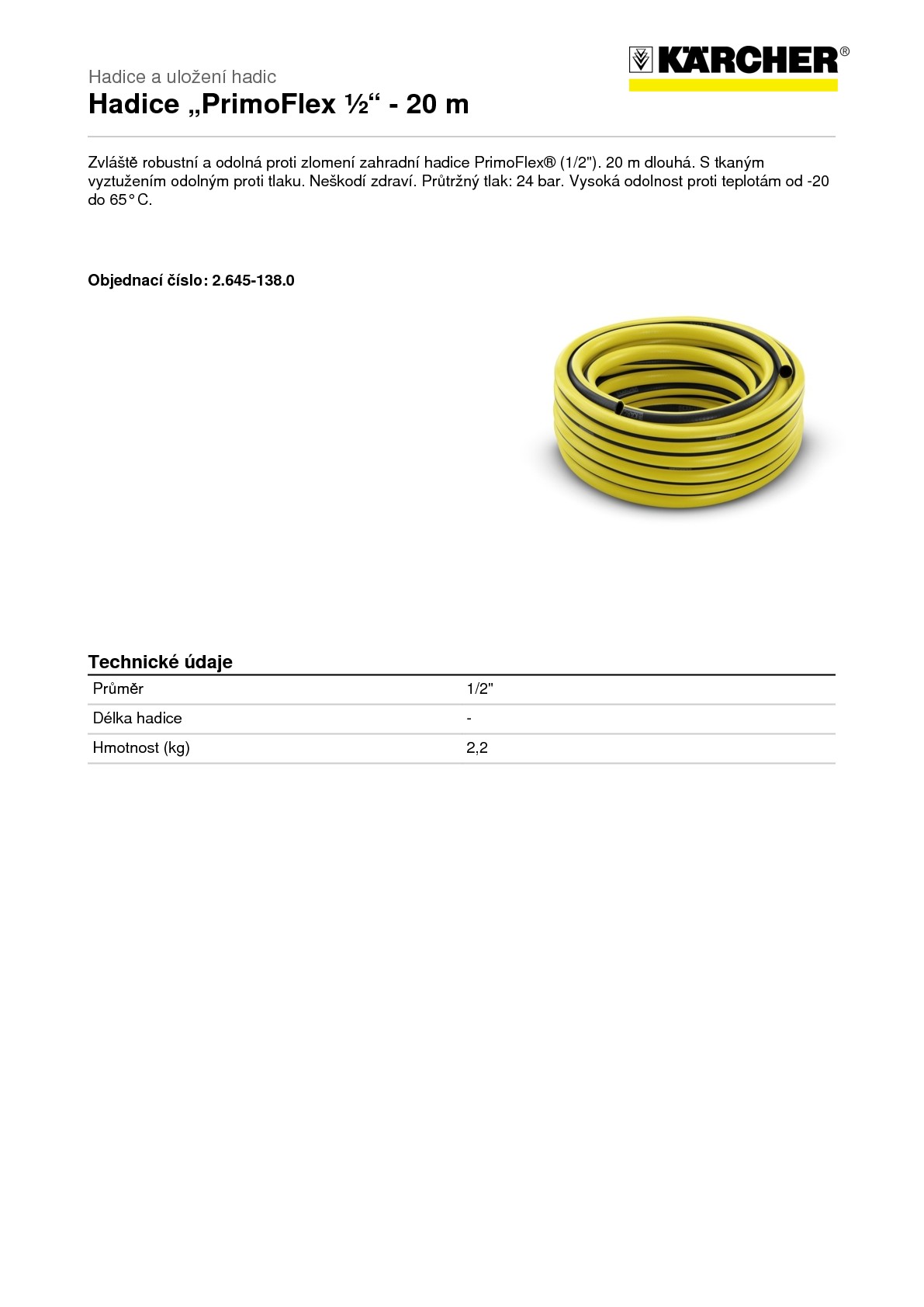 Kärcher Hadice PrimoFlex® (½ - 20 m) - Zvláště robustní a odolná proti zlomení zahradní hadice PrimoFlex® (1/2"). 20 m dlouhá. S tkaným vyztužením odolným proti tlaku. Neškodí zdraví. Průtržný tlak: 24 bar. Vysoká odolnost proti teplotám od -20 do 65° C.