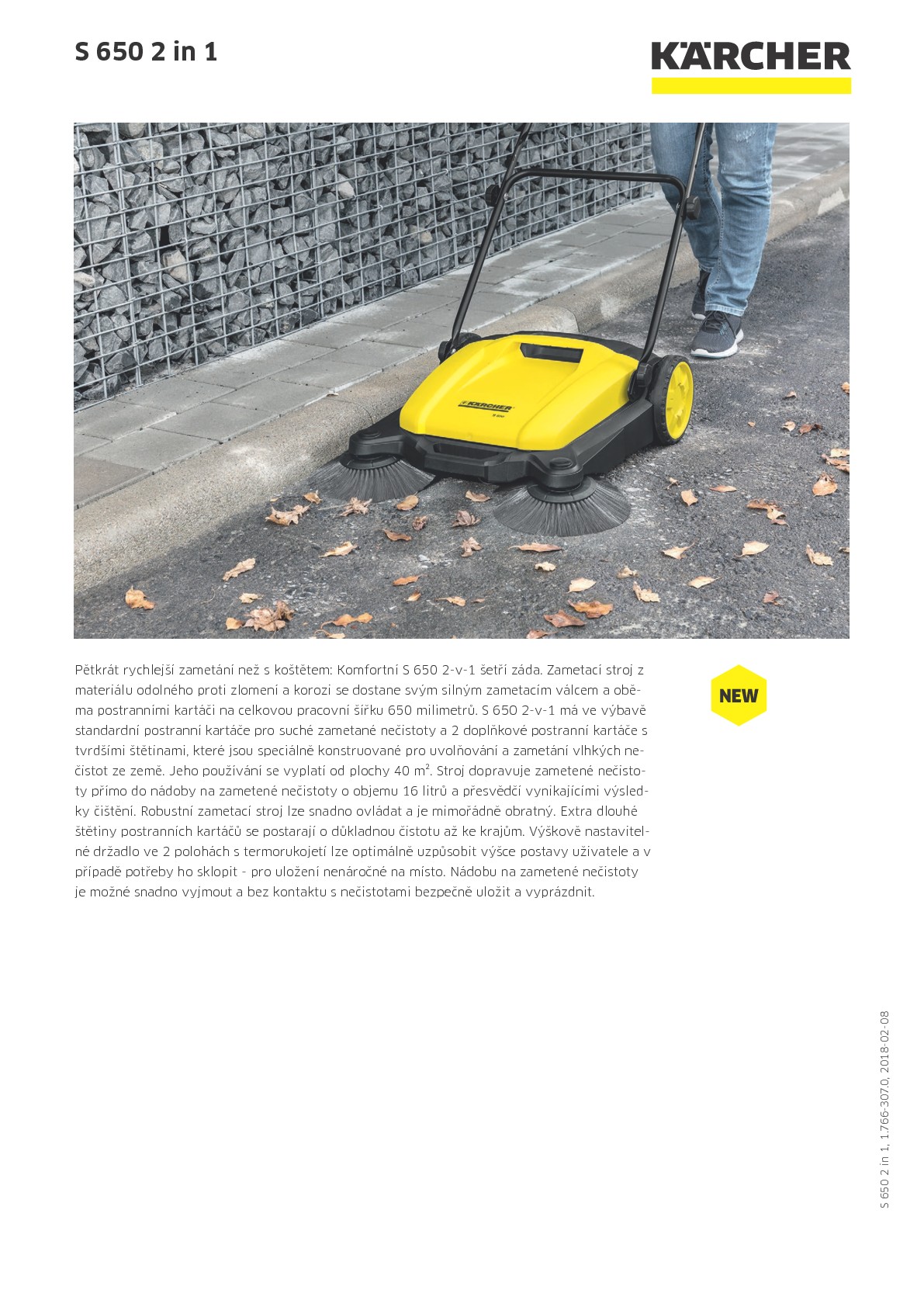 Pětkrát rychlejší zametání než s koštětem: Komfortní S 650 2-v-1 šetří záda. Zametací stroj z materiálu odolného proti zlomení a korozi se dostane svým silným zametacím válcem a oběma postranními kartáči na celkovou pracovní šířku 650 milimetrů. S 650 2-v-1 má ve výbavě standardní postranní kartáče pro suché zametané nečistoty a 2 doplňkové postranní kartáče s tvrdšími štětinami, které jsou speciálně konstruované pro uvolňování a zametání vlhkých nečistot ze země. Jeho používání se vyplatí od plochy 40 m². Stroj dopravuje zametené nečistoty přímo do nádoby na zametené nečistoty o objemu 16 litrů a přesvědčí vynikajícími výsledky čištění. Robustní zametací stroj lze snadno ovládat a je mimořádně obratný. Extra dlouhé štětiny postranních kartáčů se postarají o důkladnou čistotu až ke krajům. Výškově nastavitelné držadlo ve 2 polohách s termorukojetí lze optimálně uzpůsobit výšce postavy uživatele a v případě potřeby ho sklopit - pro uložení nenáročné na místo. Nádobu na zametené nečistoty je možné snadno vyjmout a bez kontaktu s nečistotami bezpečně uložit a vyprázdnit.