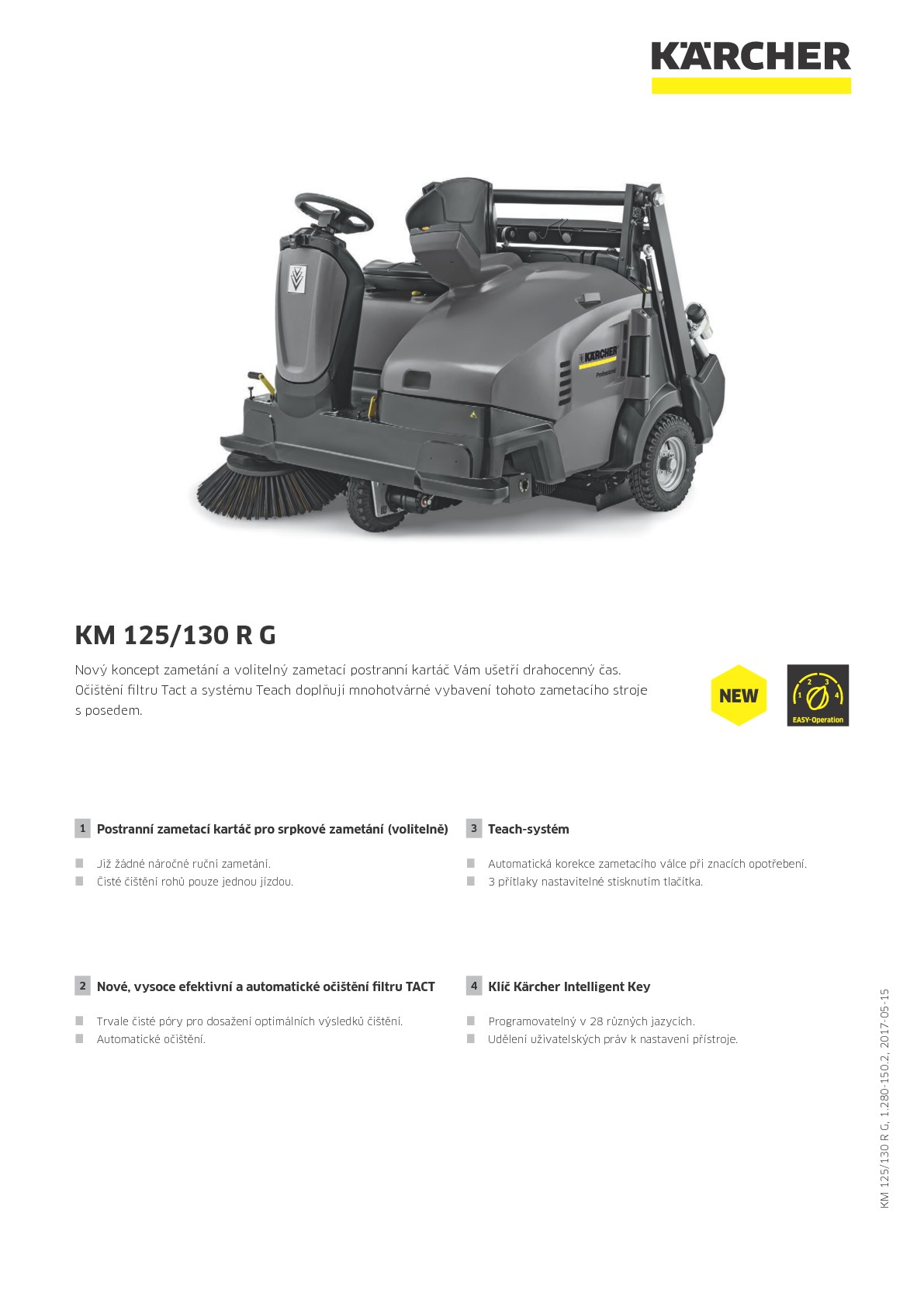 Proč byste vymetali kouty ručně, když to jde i jinak? Zametací stroj Kärcher KM 125/130 R G s posedem, s elektrohydraulickým vyprazdňováním vrchem a volitelně dostupným zametacím postranním kartáčem vyčistí kouty při pouhé jedné jízdě. I standardní verze Vás přesvědčí svým zametacím konceptem a vynaložením polovičního úsilí při čištění koutů v porovnání s jinými stroji. Pozice hlavního zametacího válce mezi zadními kolečky Vám umožní přejíždět i vyšší schůdky, aniž by se poškodil zametací systém. Teach-systém upraví v případě opotřebení hlavní zametací válec, a tím zaručuje stále nejlepší zametací výsledky. Na výběr je nastavení 3 přítlaků – vždy v závislosti na druhu podkladu a stupni znečištění. Další patenty a inovace Vám umožní bezprašnou práci (očištění filtru Tact) a definování různých uživatelských práv (patentovaný KIK-systém - Kärcher Intelligent Key Systém). Multifunkční displej vás srozumitelně provede v 28 jazycích návodem a dá vám např. spolehlivé informace o opotřebení zametacího válce nebo o aktivovaném přítlaku zametacího válce.