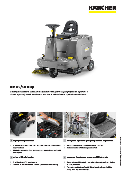 Náš základní model KM 85/50 R Bp Pack přesvědčí vynikajícím vybavením u zametacího stroje s odsáváním s posedem této cenové třídy. Součástí sériového vybavení jsou baterie a nabíječka i postranní kartáč s regulací počtu otáček, velký prachový filtr pro bezprašnou práci nebo zvnějšku viditelná kontrolka opotřebení hlavního zametacího válce. Velmi kompaktní konstrukce stroje se stará o vysokou obratnost, což umožňuje jeho nasazení především i na úzkých a zastavěných plochách. Kromě toho přesvědčí vysokým plošným výkonem ve vnitřních a venkovních prostorech a extrémně jednoduchou obsluhou. K běžné údržbě, jako například výměně hlavního zametacího válce, není zapotřebí nářadí. Výkyvně uložený válec není nutné seřizovat a přesto odstraní nečistoty i z nerovného podkladu. I přístup do vnitřku stroje zvládne obsluha bez problémů a bez použití nářadí, zatímco filtr komfortně očistí ze svého sedadla. Pohodlné je i umístnění doplňkových čisticích potřeb díky našemu integrovanému systému Home-Base.