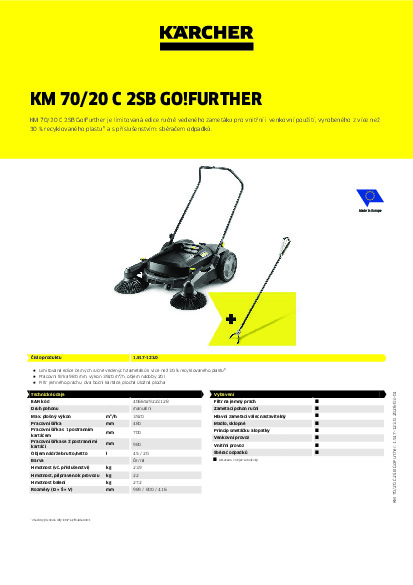 KM 70/20 C 2SB Go!Further je limitovaná edice ručně vedeného zametáku pro vnitřní i venkovní použití, vyrobeného z více než 30 % recyklovaného plastu¹⁾ a s příslušenstvím: sběračem odpadků.