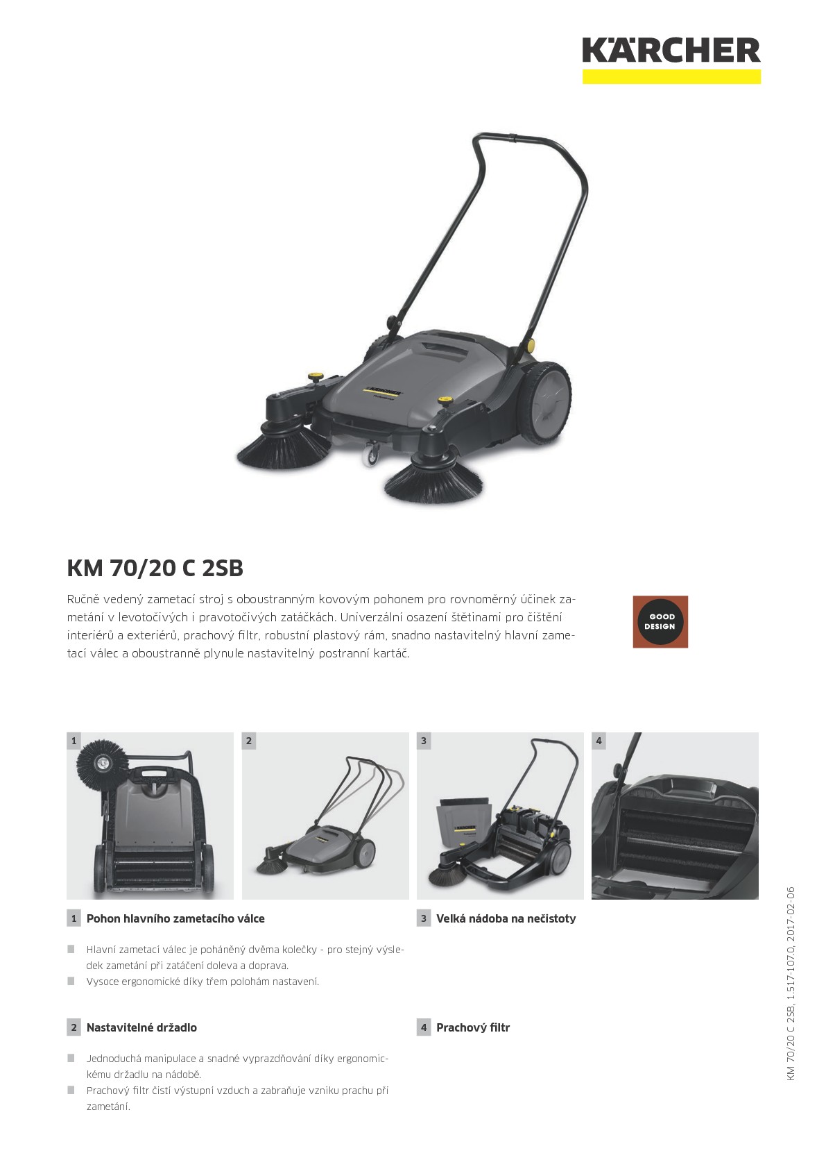 Postraní kartáče jsou odklopitelné. Pohon hlavního zametacího válce umožňuje snadné manévrování. Oboustranný pohon stroje je manuální a téměř nepodléhá opotřebení - stroj je téměř bez údržbový. Hlavní válec je nastavitelný do 6ti výškových poloh. Přítlak postranních kartáčů je regulovatelný. Štětiny kartáčů jsou univerzální pro venkovní i vnitřní použití. Nádoba na zametené nečistoty (42 l) se nechá jednoduše vyjmout a vyprázdnit.