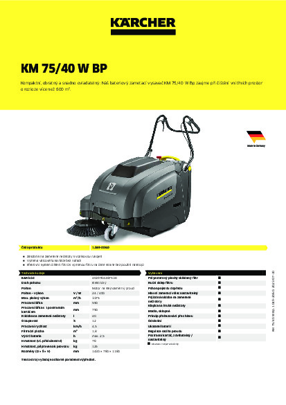 KM 75/40 W Bp, bateriově poháněný, zametací stroj s pohonem pro efektivní zachycení prachu. Další technické údaje: Pohon:> 400 W stejnosměrný motor> variabilní rychlost zametání: 0 - 4,5 km / h zametací systém:> systém svržení> výměna bočního kartáče bez použití nástrojů> zvedání / spouštění bočního kartáče> výměna hlavního kartáče a přestavování bez použití nástrojů Filtrační systém:> polyesterový skládaný filtr (plocha filtru: 1,8 m2)> efektivní mechanické čištění filtru> výměna filtru bez nářadí Nádoba na odpad:> kapacita: 40 l> nádoba s válečky, zapuštěnou rukojetí a výsuvným vozíkem grip Operation:> EASY Operation Display> výškově nastavitelná tlačná rukojeť> trakční pohon a ovládání klapek hrubých nečistot na tlačné rukojeti> pohodlné zvedání / spouštění bočního kartáče.