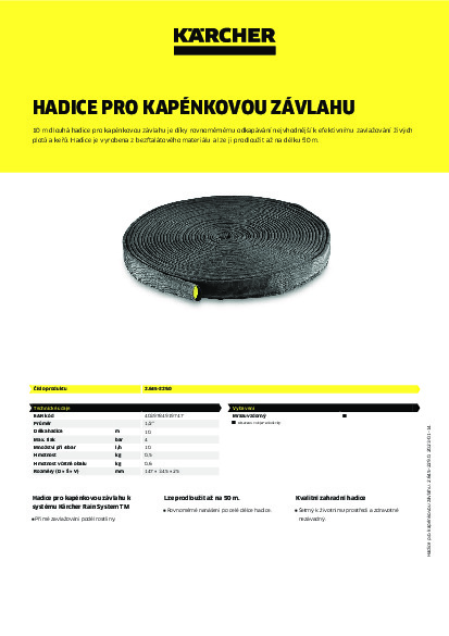10 m dlouhá hadice pro kapénkovou závlahu je částí systému Kärcher Rain System®. Voda odkapává rovnoměrně přes celou délku z hadice a končí přesně tam, kde je jí potřeba. Tím je zajištěno vysoce efektivní zavlažování živých plotů a keřů. Hadici lze podle potřeby zkrátit a pomocí I-dílů prodloužit nebo díky T-dílům rozdvojit (maximální délka hadice je 50 m). K připojení na systém Kärcher Rain System®se doporučuje zejména T-díl. Potřebné množství vody pro hadici pro kapénkovou závlah ulze optimálně nastavit nastavitelným bočním výstupem. Dvouvrstvá hadice je bez obsahu ftalátů, kadmia, baria a olova, a proto zcela zdravotně nezávadná. V optimálním případě hadice pracuje pod tlakem až 2 bar. Montáž hadice je velice jednoduchá a není k ní potřeba žádného nářadí. Kärcher Rain System® spojuje výhody mikroodkapávání a běžného zavlažování, pracuje pod tlakem až 4 bar a lze jej přizpůsobit téměřjakémukoliv typu zahrady.