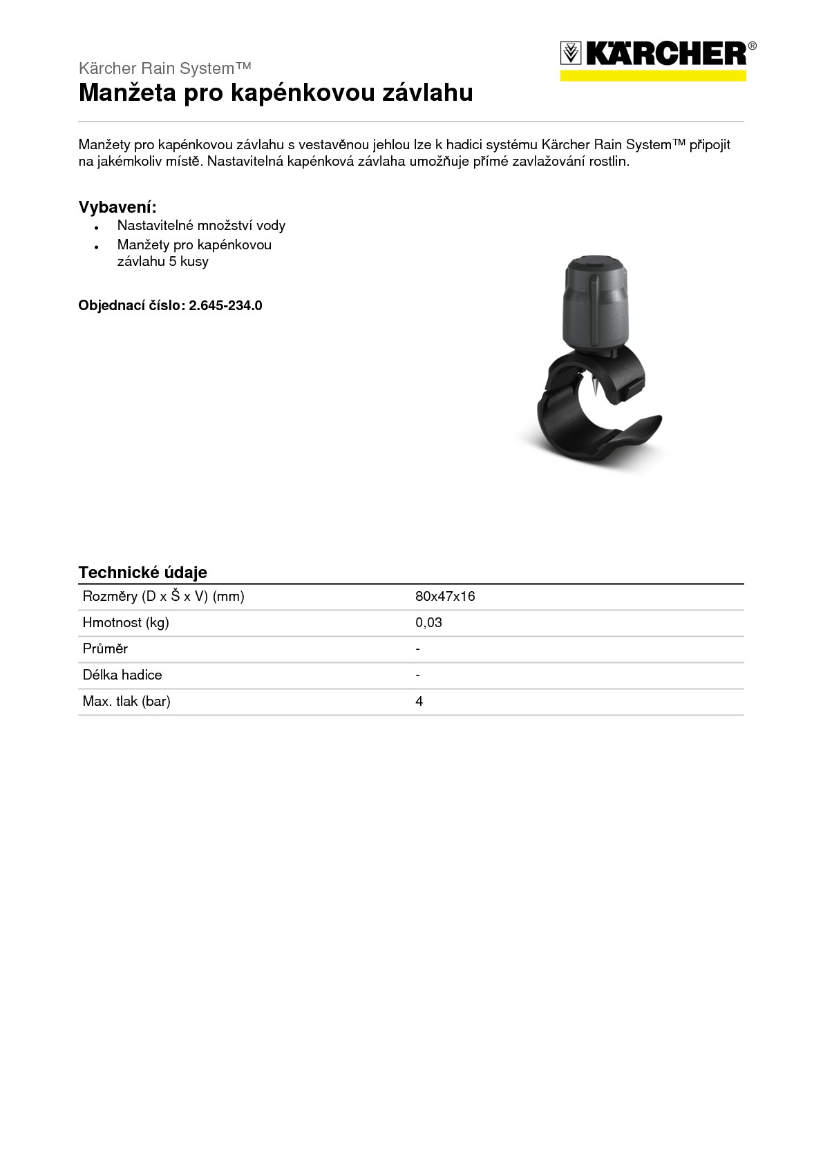 Manžety pro kapénkovou závlahu jsou částí systému Kärcher Rain System™ a umožňují přímé zavlažování rostlin. Lze je připojit k hadici systému Kärcher Rain System™ na jakémkoliv místě. Montáž je velice rychlá, snadná a není k ní potřeba žádného nářadí. Za tímto účelem se manžeta otevře, vloží se do ní zavlažovací hadice, která se na požadovaném místě napíchne vestavěnou jehlou a upevní se uzavřením manžety. Množství vody od 0 do 10 l/h lze podle potřeby nastavit otočnou hlavou, čímž se předejde zbytečnému plýtvání vodou. Vysoce efektivní zavlažovací systém Kärcher Rain System™, který pracuje pod tlakem 4 bar a je vybaven 1/2“-hadicí s manžetami pro kapénkovou závlahu a postřik, spojuje výhody mikroodkapávání a běžného zavlažování. Systém Kärcher Rain System™ lze přizpůsobit téměř jakémukoliv typu zahrady a spolu se SensoTimerem, kterým se nastaví zavlažování podle potřeby, funguje perfektně.