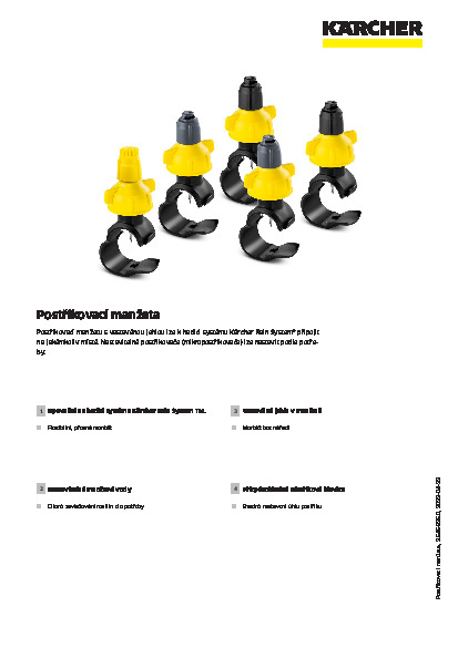 Postřikovací manžety jsou částí systému Kärcher Rain System™. Lze je připojit k hadici systému Kärcher Rain System™ na jakémkoliv místě. Montáž je velice rychlá, snadná a není k ní potřeba žádného nářadí. Za tímto účelem se vestavěná jehla v otevřené manžetě jednoduše nabodne na hadici. Manžeta se na hadici upevní tím, že se uzavře. Směřování úhlu postřiku lze nastavit horizontálně a vertikálně otočnou hlavou. Množství vody od 0 do 55 l/h lze podle potřeby úsporně nastavit přímo na trysce. Vysoce efektivní zavlažovací systém Kärcher Rain System™, který pracuje pod tlakem 4 bar a je vybaven 1/2“-hadicí s manžetami pro kapénkovou závlahu a postřik, spojuje výhody mikroodkapávání a běžného zavlažování. Systém Kärcher Rain System™ lze přizpůsobit téměř jakémukoliv typu zahrady a spolu se SensoTimerem, kterým se nastaví zavlažování podle potřeby, funguje perfektně.