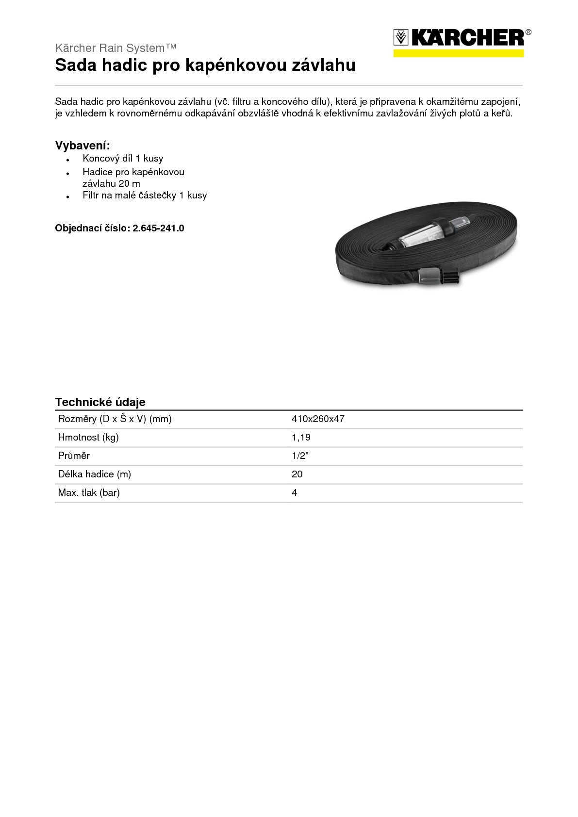Sada hadic pro kapénkovou závlahu je připravena k okamžitému zapojení a obsahuje filtr na malé částečky, 20 m dlouhou hadici pro kapénkovou závlahu a koncový díl. Po celé délce odkapává z hadice rovnoměrně voda. Vzhledem k tomu, že voda odkapává přímo v místě, kde je to potřeba, jsou živé ploty a keře optimálně zavlažovány. Hadici lze podle potřeby zkrátit a uzavřít koncovým dílem. Dvouvrstvá hadice neobsahuje ftaláty, kadmium, barium a olovo, a proto je zcela zdravotně nezávadná. V ideálním případě hadice pracuje pod tlakem max. 2 bar. Filtr na malé částečky chrání hadici pro kapénkovou závlahu před malými částečkami nečistot. Filtrační vložku lze vyjmout a vyčistit. Na vstupní straně se nachází přípojka k vodovodnímu kohoutku, která je kompatibilní se všemi známými západkovými systémy. Efektivní zavlažovací systém Kärcher Rain System® spojuje výhody mikroodkapávání a běžného zavlažování. Kärcher Rain System® pracuje pod tlakem 4 bar a lze jej individuálně přizpůsobit téměř jakémukoliv typu zahrady.
