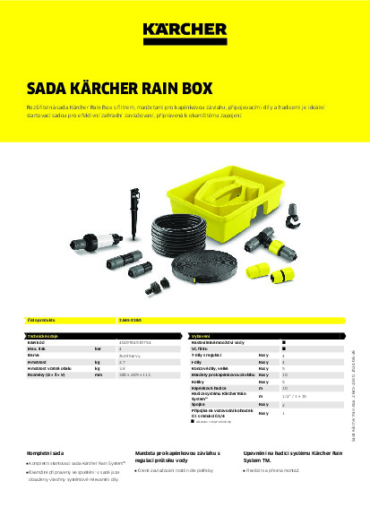 Sada Kärcher Rain Box je ideálním vstupem do světa efektivního a úsporného zahradního zavlažování podle potřeby. Sada Kärcher Rain Box obsahuje přípojku na vodovodní kohoutek G1 s redukcí G3/4, 2 spojky, 1 filtr, 15 m dlouhou hadici systému Kärcher Rain System™ (k upevnění manžet), 10 m dlouhou hadici pro kapénkovu závlahu, 4 T-díly s regulací, 4 I-díly, 10 manžet pro kapénkovou závlahu, jakož i 5 kolíků k upevnění hadic. Všechny díly lze namontovat bez použití jakéhokoliv nářadí. Manžety pro kapénkovou závlahu mohou být na hadici systému Kärcher Rain System™ volně připojeny a regulovány (0-10 l/h). Hadice pro kapénkovou závlahu odkapává rovnoměrně po celé délce hadice a lze ji optimálně nastavit nastavitelným výstupem na T-dílu. Systém pracuje pod tlakem 4 bar, lze jej individuálně přizpůsobit téměř jakémukoliv typu zahrady a spolu se SensoTimerem, kterým se nastaví zavlažování podle potřeby, funguje perfektně.