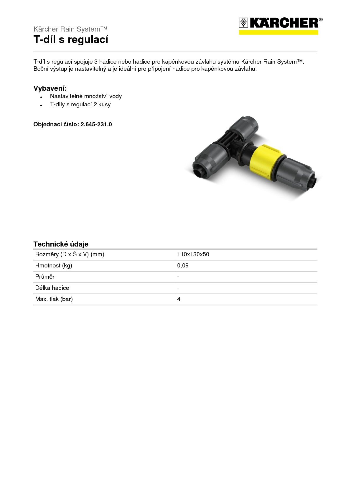 T-díl s regulací je částí systému Kärcher Rain System™. Spojuje k sobě tři hadice nebo hadice pro kapénkovou závlahu systému Kärcher Rain System™ a umožňuje tak pokládání dvou na sobě nezávislých hadicových vedení. Tak lze systém perfektně přizpůsobit individuálním požadavkům. Na bočním výstupu lze nastavit množství vody a tlaku, hodí se tak např. k připojení hadice pro kapénkovou závlahu. Montáž hadice je velice jednoduchá a není k ní potřeba žádného nářadí. Za tímto účelem se hadice jednoduše nasune na T-díl a upevní převlečnou maticí. Vysoce efektivní zavlažovací systém Kärcher Rain System™ spojuje výhody mikroodkapávání a běžného zavlažování, pracuje pod tlakem až 4 bar a je vybaven 1/2"-hadicí s těsnícími manžetami pro kapénkovou závlahu a postřik. Systém Kärcher Rain System™ lze přizpůsobit téměř jakémukoliv typu zahrady a spolu se SensoTimerem, kterým se nastaví zavlažování podle potřeby, funguje perfektně.
